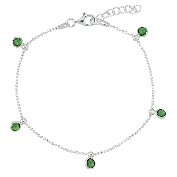 Bead Chain with dangling 4mm Round Emerald CZ 6.5" plus 1" extension - Sterling Silver with Anti Tarnish