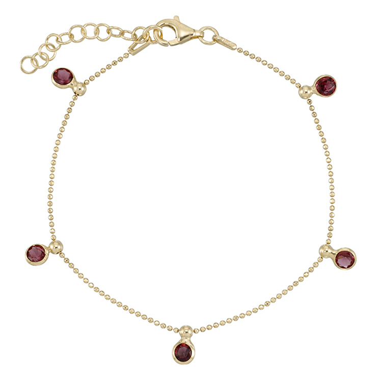 Bead Chain with dangling 4mm Round Ruby CZ 6.5" plus 1" extension - Sterling Silver Gold Plated with Anti Tarnish