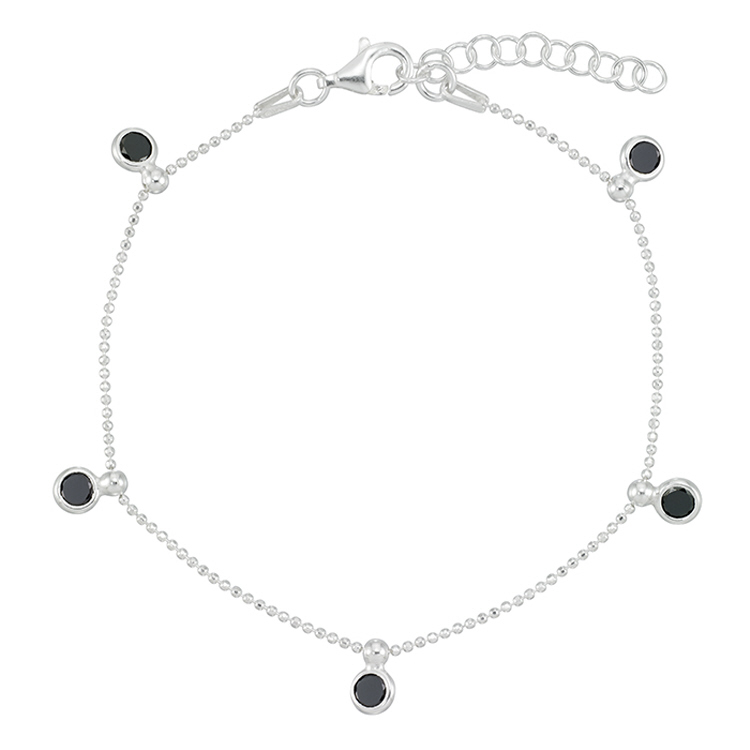 Bead Chain with dangling 4mm Round Black CZ 9" plus 1.5" extension - Sterling Silver with Anti Tarnish