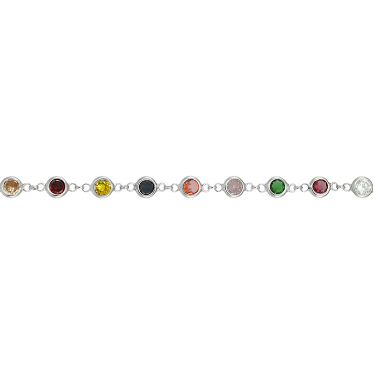 1.6mm Cable Chain with 4.5mm Round Mutlicolored CZs - Sterling Silver Rhodium Plated